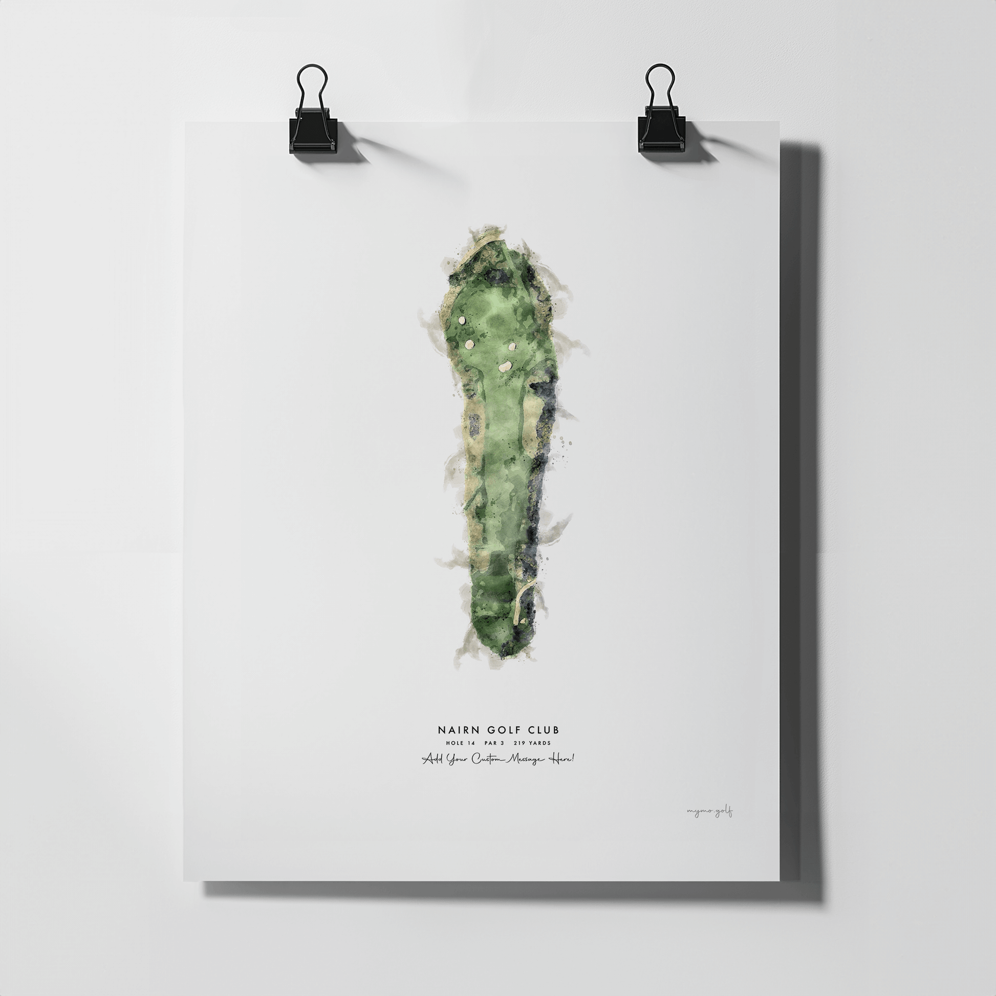 Celebrate the precise challenge and coastal elegance of Nairn’s 14th hole with this personalised art print, the perfect gift for anyone who has felt the spirit and beauty of Scottish links golf.